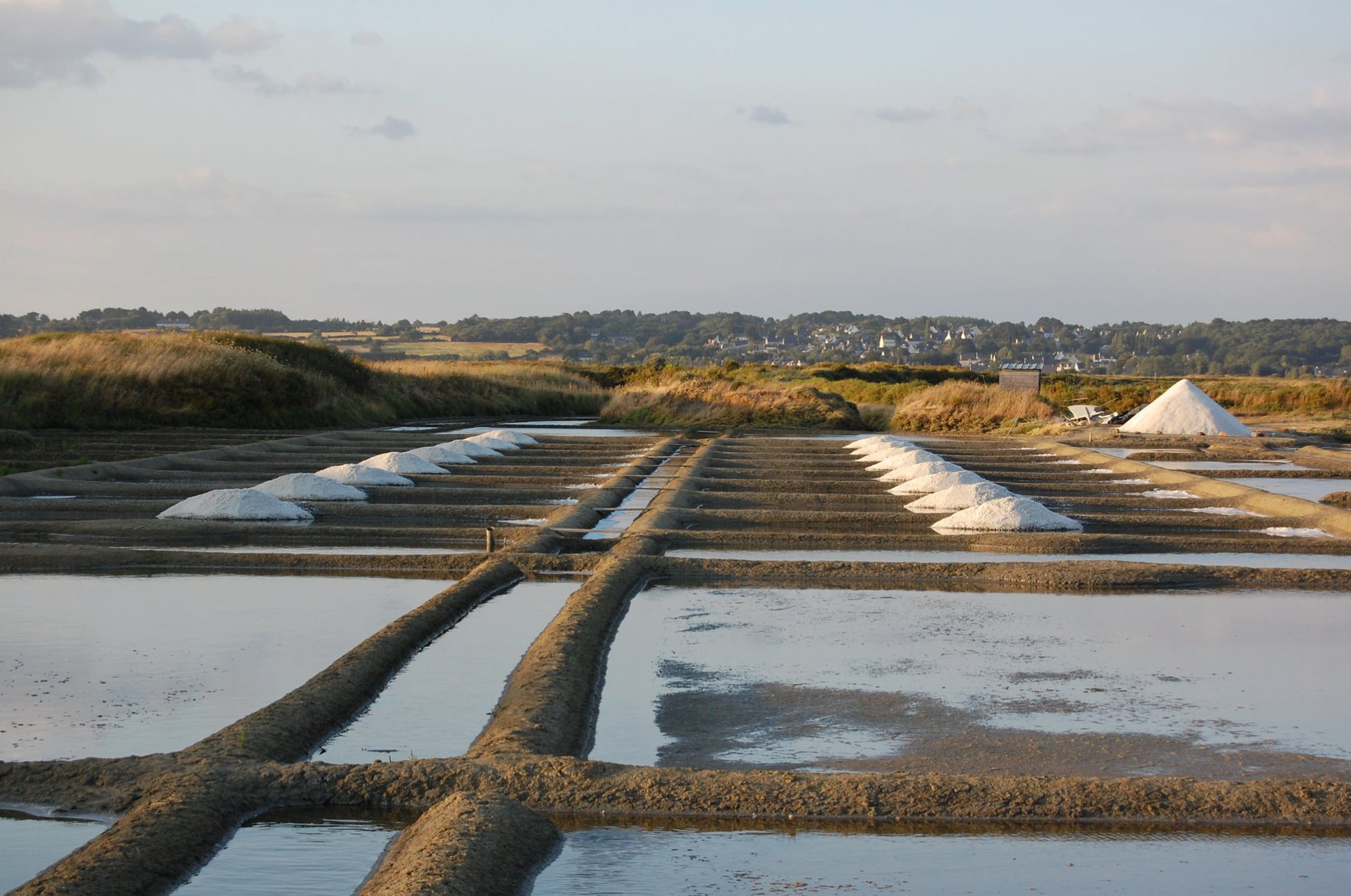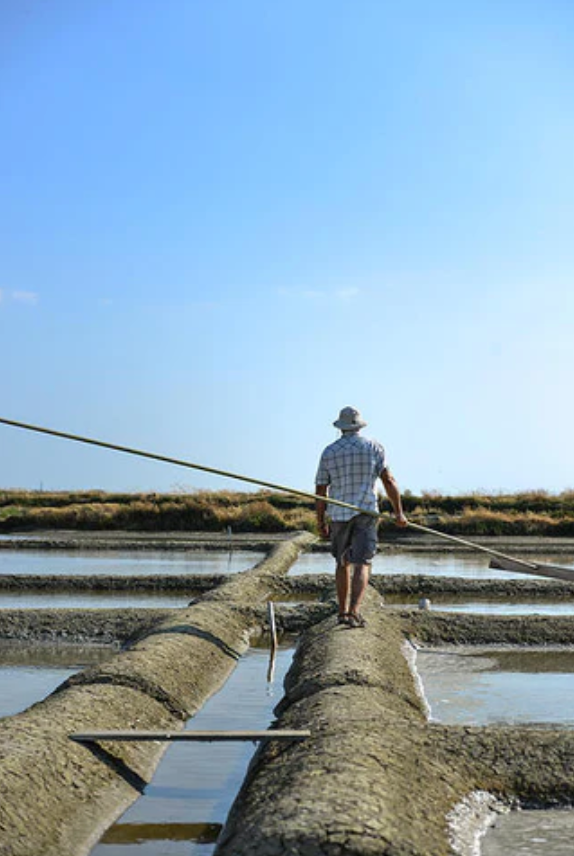 海水はまず「ヴァジエール」と呼ばれる貯水池に貯められ、ここで塩分が濃縮され、不純物や泥が分離されます。その後、「コビエ」と呼ばれる濃縮池を通り、地形の高低差を利用して塩田へと送られ、最終的に結晶池へと流れ込みます。こうして塩分濃度を高めた海水が、海風に吹かれることで水面に結晶し、「塩の花」が咲くのです。