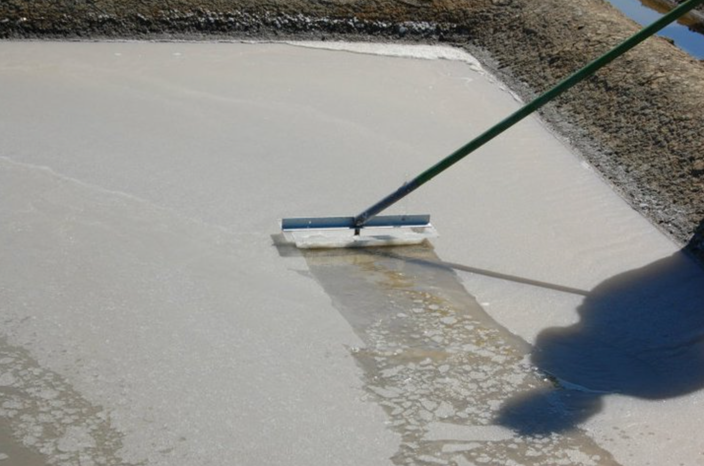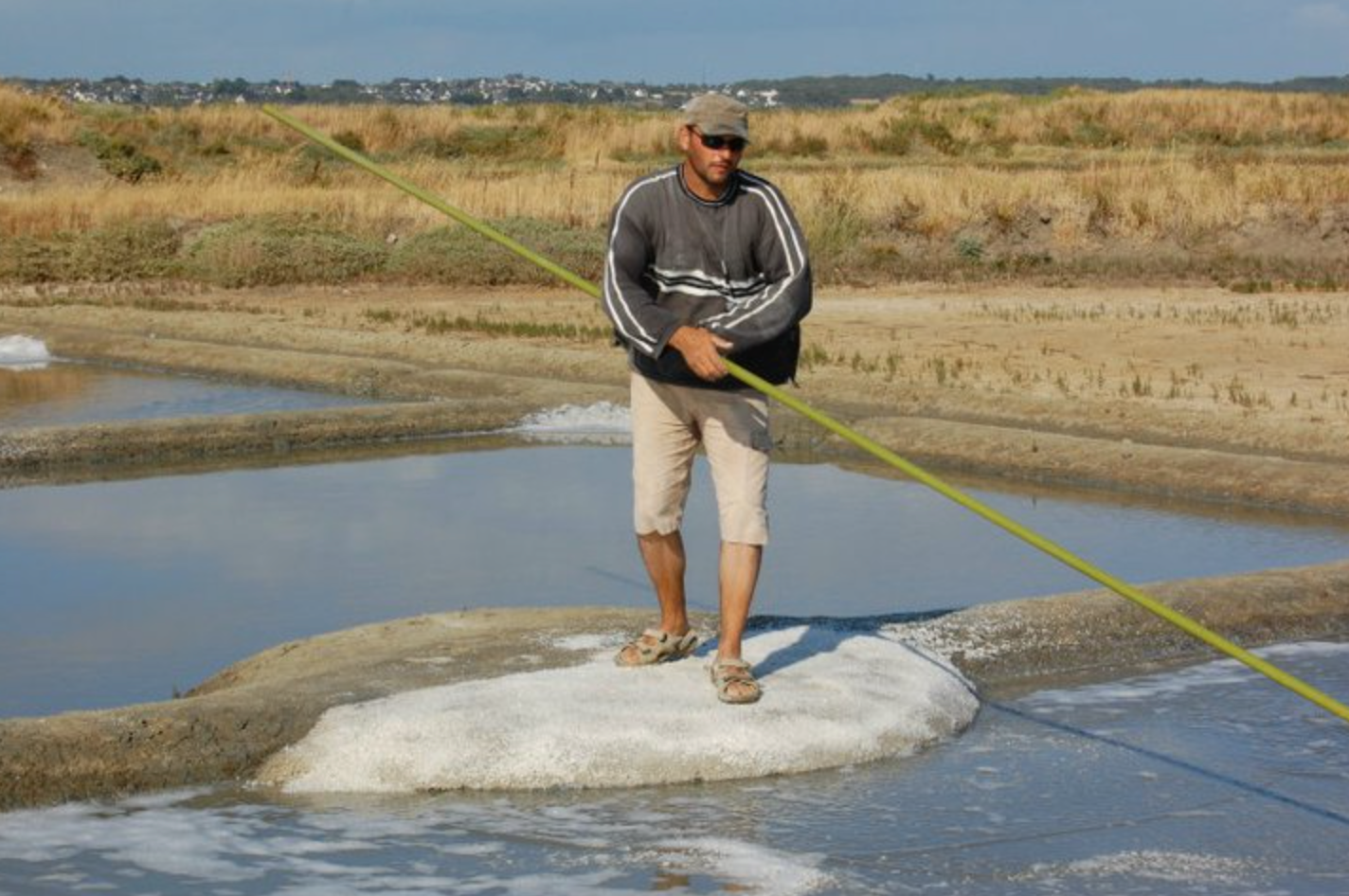 収穫には「ルース」と呼ばれる、棒の先に平たい板が付いた道具を使います。この作業は非常に繊細で、高い熟練を要します。結晶池の水深はわずか1〜2センチほど。底に触れてしまうと、それまでにすくい取った塩はすべて使えなくなってしまいます。真っ白なフルール・ド・セルだけを選り分けるため、この工程はとりわけ重要です。