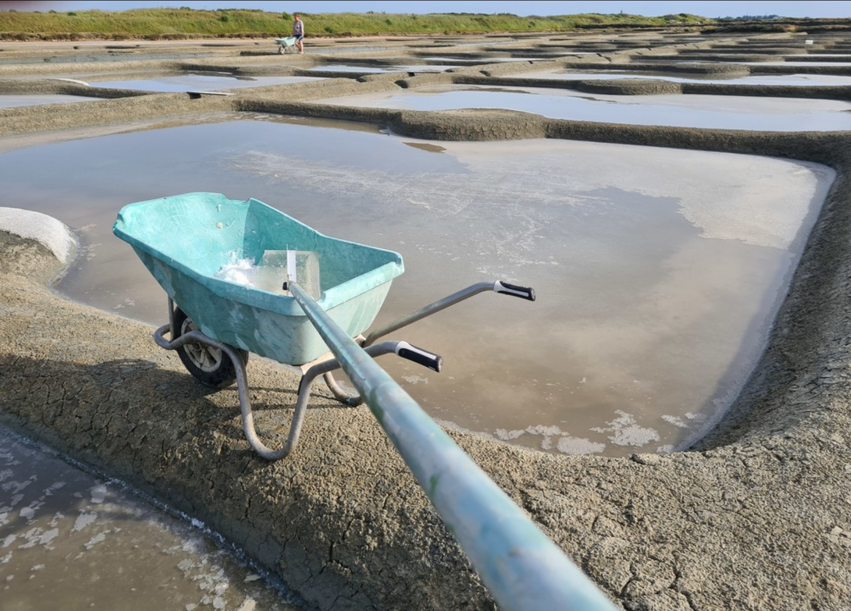 ルースの棒の長さは約3メートル。先端には最大で2キロものフルール・ド・セルの重みがかかります。その扱いの難しさは想像に難くありません。ルースがいっぱいになると、塩はプラスチック製の一輪車に集められ、朝方まで水を切った後、作業場へと運ばれます。